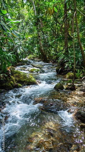 © Iswanto, Obraz premium Tranquil Stream Flowing Through Lush Green Forest.