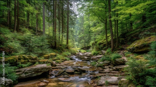 © 69, Fototapeta premium Tranquil Stream Flowing Through Lush Green Forest with Verdant Foliage and Rocky Bed Amidst Serene Wilderness