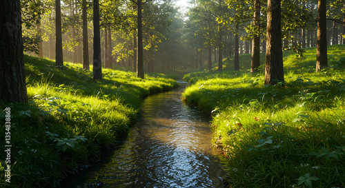 © Rido, Obraz premium Tranquil Stream Flowing Through Sunlit Forest with Lush Greenery