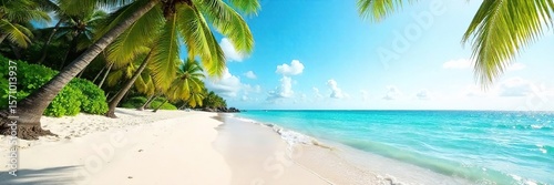 © Benjamas, Obraz premium Tranquil Sunrise Beach Scene Turquoise Waters, Soft Sand, Swaying Palms