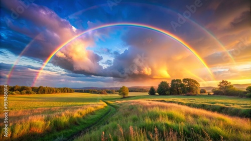 © PloyJai, Obraz premium Tranquil sunrise in the countryside featuring a vibrant double rainbow