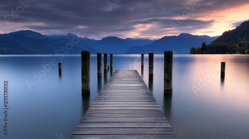 © SHI, Obraz premium Tranquil sunrise over a calm lake, evoking peace and serenity.