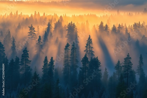 © nik_yurginson, Obraz premium Tranquil sunrise over a foggy forest creating a serene atmosphere
