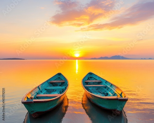 © Stepan, Fototapeta premium Tranquil sunrise over calm lake with two boats and colorful sky
