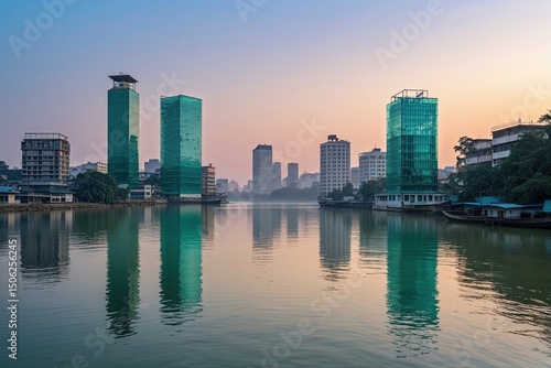 © Michael, Fototapeta premium Tranquil Sunrise Over Dhaka Inlet with Modern Glass Architecture