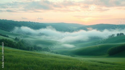 Fototapeta premium Tranquil Sunrise Over Misty Hills