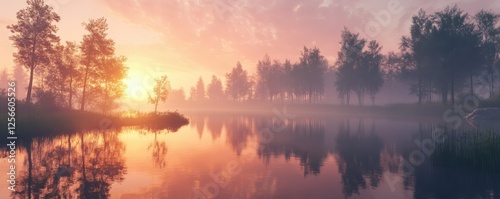 Obraz premium Tranquil sunrise over misty lake with reflective water and silhouetted trees