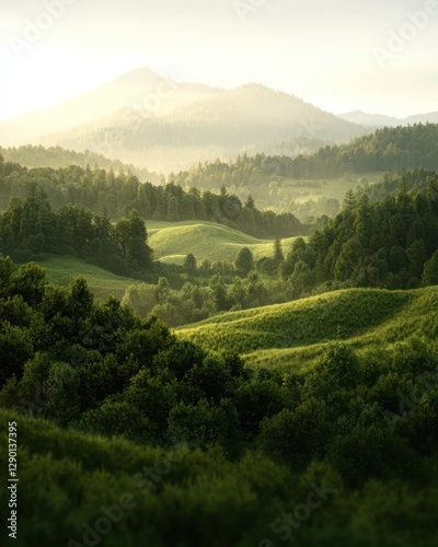 Fototapeta premium Tranquil sunrise overrolling hills majestic mountains nature landscape serene...