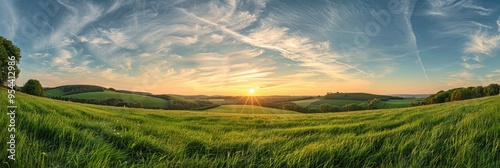 © AkuAku, Obraz premium Tranquil sunrise scene with the sun rising over a lush green field and a picturesque sky decorated with wispy cirrus clouds
