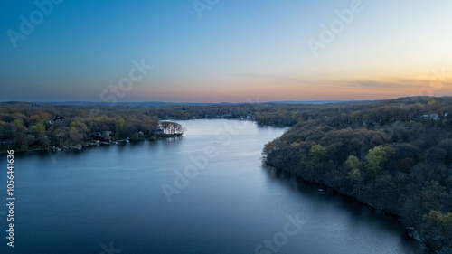 © contentzilla, Obraz premium Tranquil sunset over a serene lake, capturing the peaceful reflections of fading sunlight on calm waters with silhouetted trees on the shoreline.