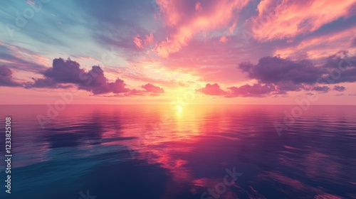 © -Quantum Pixels-, Obraz premium Tranquil Sunset over Ocean with Vibrant Reflections and Soft Clouds Ideal for Text Placement in Serene Landscape Background