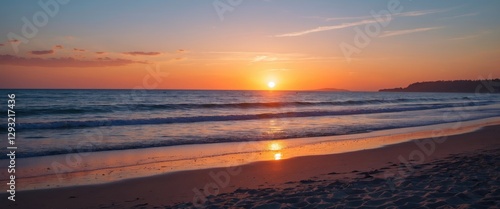 © DigitalDruid, Fototapeta premium Tranquil Sunset Over Serene Beach Waves Reflecting Warm Hues on Sandy Shoreline Peaceful Evening Atmosphere Relaxing Coastal View