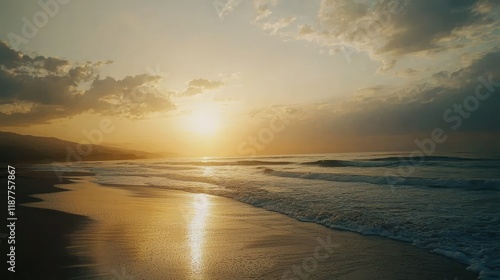 Fototapeta premium Tranquil Sunset Over Serene Beach with Gentle Waves and Clouds