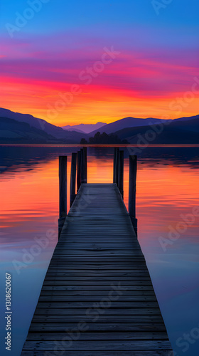 © Hettie, Obraz premium Tranquil Sunset Over Serene Lake with Silhouetted Mountains and Wooden Pier