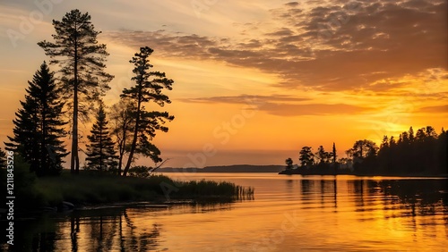 Fototapeta premium "Tranquil Sunset Over Serene Lake with Vibrant Reflections"