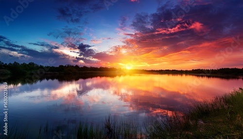 © Mikael, Fototapeta premium tranquil sunset over still water with colorful sky reflections