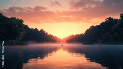 © warunthorn, Obraz premium Tranquil Sunset Over Still Water with Silhouette of Bird