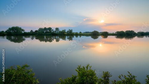 Obraz premium Tranquil Sunset Over Still Waters Reflecting Trees and Sky a Serene and...