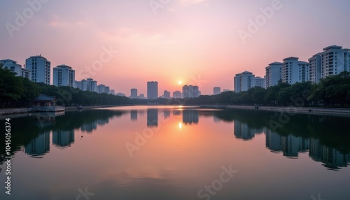 © SwathiFX, Fototapeta premium Tranquil sunset over urban lake