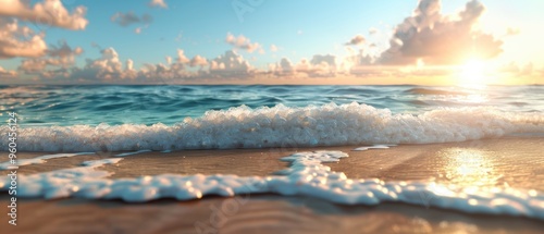 Fototapeta premium Tranquil Sunset: Photorealistic of Peaceful Beach with Calm Waves and Sandy...