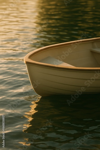 © Ulyana, Obraz premium Tranquil sunset reflecting off a wooden rowboat on calm waters