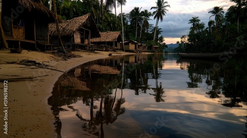 Fototapeta premium Tranquil sunset reflection remote village nature photography serene water...