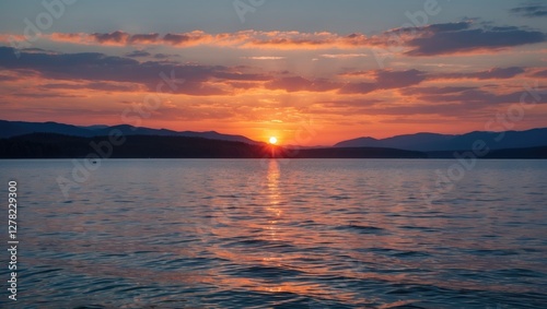 © The 2R Artificiality, Obraz premium Tranquil Sunset Reflections Over Calm Lake with Long Exposure Technique and Rolling Hills in the Background