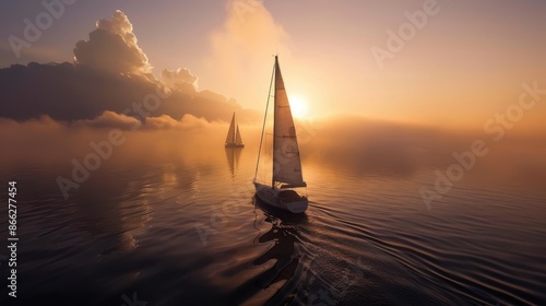 Fototapeta premium Tranquil Sunset Sailing with Boats on Calm Water and Dramatic Sky in the...