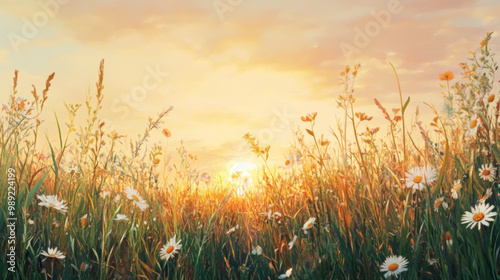 © ilyas, Fototapeta premium Tranquil Sunset Scene Tall Grass and Wildflowers Bathed in Golden Light