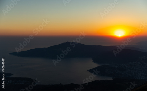 © evannovostro, Fototapeta premium Tranquil sunset slides below dark distant mountains, casting warm orange light