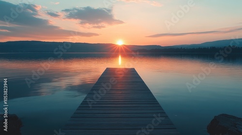 Obraz premium Tranquil Sunset View of a Wooden Dock Stretching Over Water