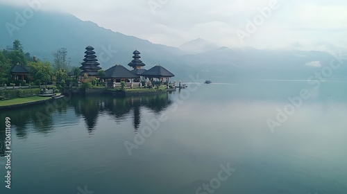 © Berkah, Fototapeta premium Tranquil Temple Lake And Misty Mountain View