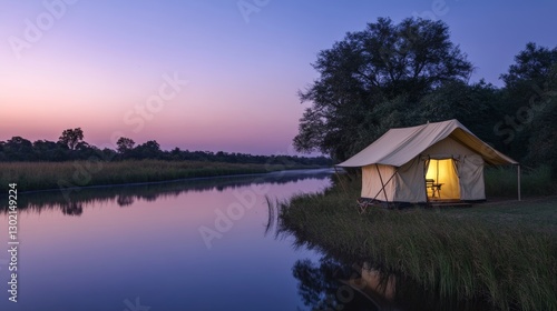 Fototapeta premium Tranquil Tent Cabin: Riverbank Retreat at Twilight