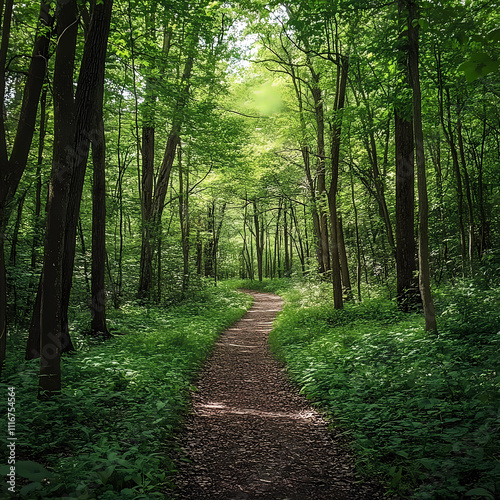 Fototapeta premium Tranquil Trek: Experience a Lime Green Forest Path through a Hiker's Eyes