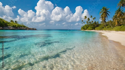 Fototapeta premium Tranquil Tropical Beach Featuring Crystal Clear Water and Lush Palm Trees...