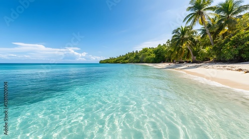 © pkproject, Fototapeta premium Tranquil Tropical Beach Landscape with Crystal-Clear Ocean Waves and Sandy Shore