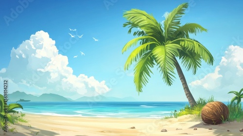 Fototapeta premium Tranquil Tropical Beach Scene with Palm Tree and Calm Waters