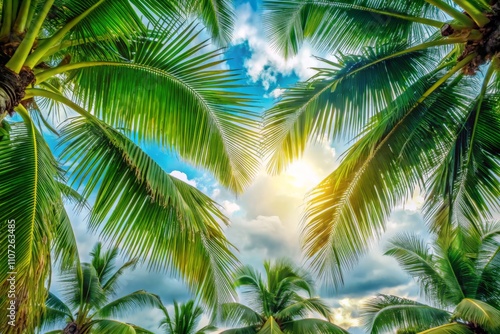 © Wanlop, Fototapeta premium Tranquil Tropical Escape with Coco Palm Tree and White Sky - Perfect Neutral Background for Relaxation and Text Space