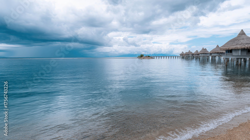 © Gun, Fototapeta premium Tranquil Turquoise Ocean Scene with Gentle Rolling Waves Under a Cloudy Sky and Overwater Bungalows on the Horizon