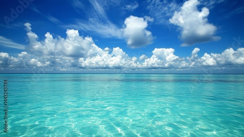© LintanAmalliyah, Obraz premium Tranquil Turquoise Ocean Under a Blue Sky with Fluffy Clouds