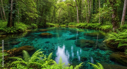 © Edi Purnomo, Fototapeta premium Tranquil Turquoise Spring Hidden in a Lush Green Forest.