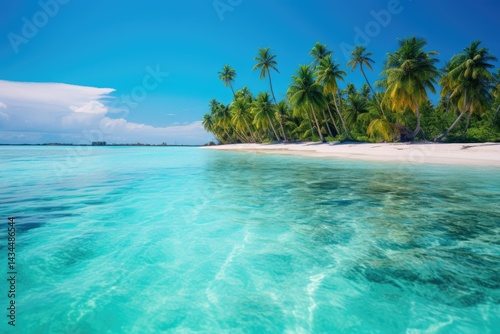 © jayantha, Fototapeta premium Tranquil turquoise water laps a pristine white sand beach fringed by lush palm trees under a vibrant blue sky.