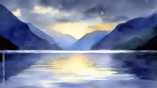 © fledermausstudio, Fototapeta premium Tranquil twilight painting of mountains reflected in calm water