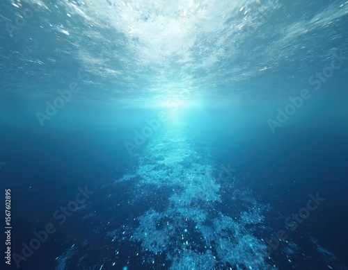 © Pete, Fototapeta premium Tranquil underwater abstract data flow ocean landscape. Serene blue sea with light rays penetrating depths. Visualizes digital information, programming, and aquatic system harmony.