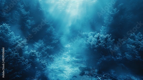 © Aether Pixels, Fototapeta premium Tranquil Underwater Double Exposure Silhouette with Deep Blue Hues - Abstract Marine Life Texture Close Up, Copy Space for Design Concepts