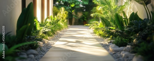 © Galina, Fototapeta premium Tranquil villa path with lush plant decoration. Generative AI image