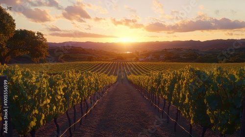 © Pixel Alchemist, Naklejka premium Tranquil vineyard landscape at sunset with lush grapevines and scenic hills.