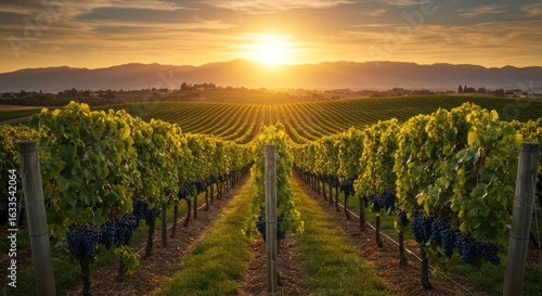 Naklejka premium Tranquil vineyard panorama under a golden sunset, showcasing rows of...