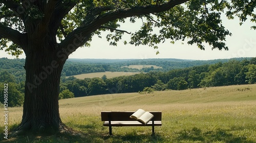 © Esmeralda, Naklejka premium Tranquil Vista Book on Bench Under Tree Shade