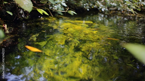 © Pickoloh, Obraz premium Tranquil water reflection with green foliage